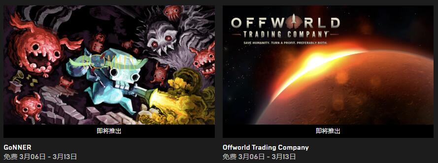 下周免费领取游戏有两款,分别为《奇界行者》(GoNNER)《外星贸易公司》(Offworld Trading Company),免费领取时间为北京时间3月5日晚11点至3月12日晚11点。