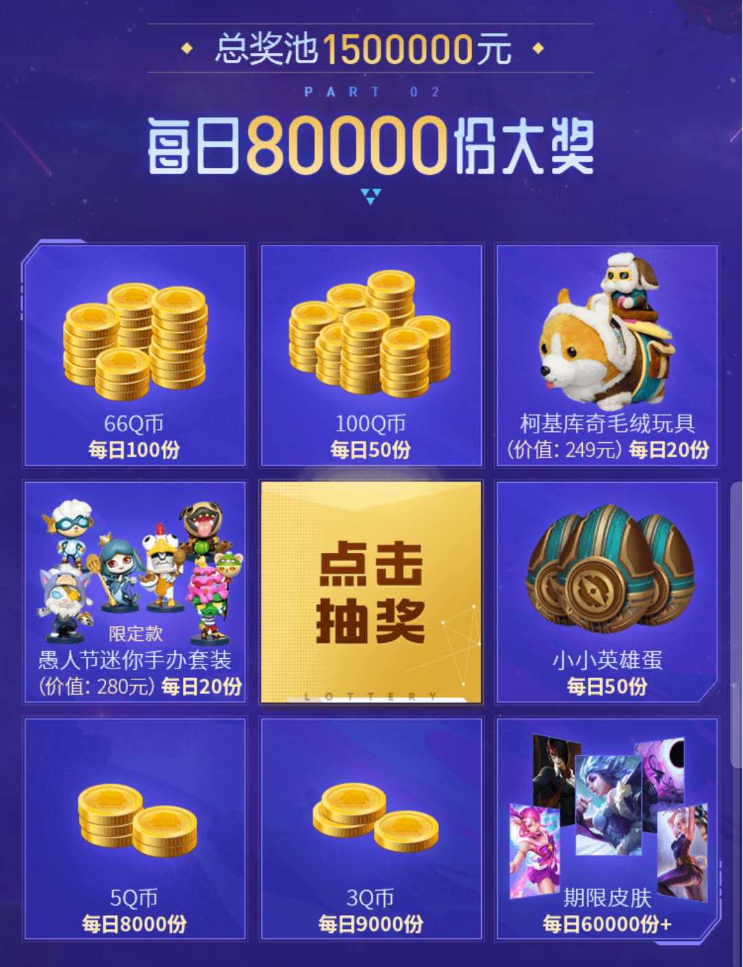 活动规则:每晚9点,路人王PK主播,你只需要完成简单的任务即可获得积分,10积分即可兑换投票券,给最强王者路人或则主播投票。如果你投票的队伍今日获胜,你将可以抽取每日8万份大礼,礼品包含海量Q币,小小英雄蛋,珍贵限定周边和海量期限皮肤。