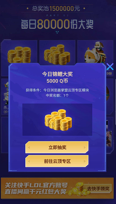 每日锦鲤:每日掉落一条巨大锦鲤,5000QB/万元现金/精美皮肤……只需要浏览掌盟云顶专区即可参加抽奖。